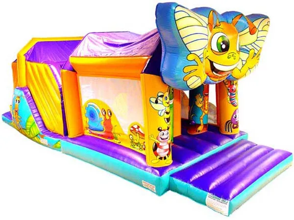 A semi-enclosed bounce house with attached slide. Ideal for narrower gardens and provides excellent shelter from light rain.